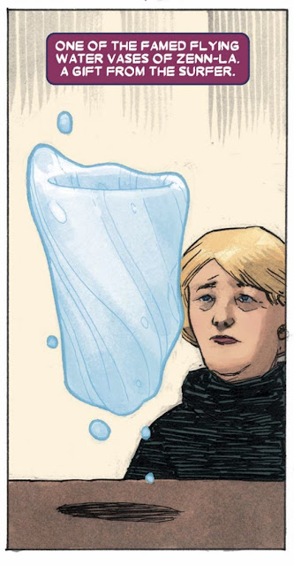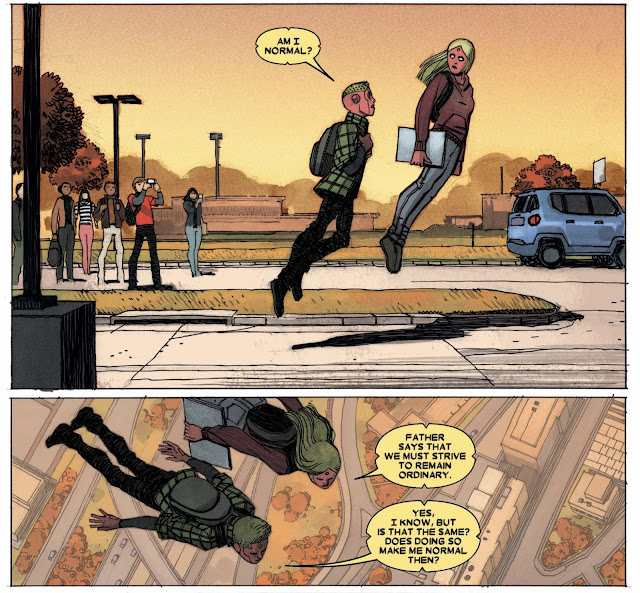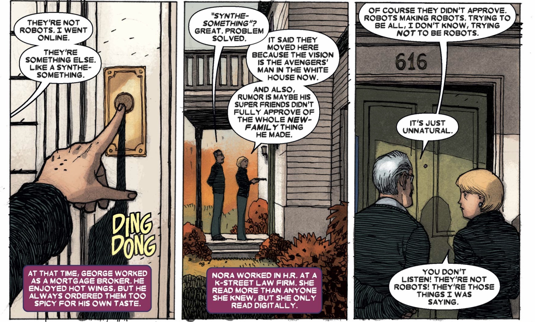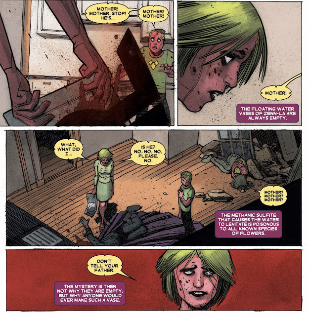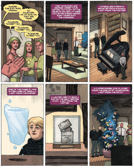 These somewhat pointless boring details lull readers into a false sense of security. It's pedestrian descriptions that implies the story seem like it is about the boring neighborhood. But then writer Tom King will interject quick, unsettling details to shock the readers' system. Like, when Vision shows the Wundagore Everbloom plant to the neighbours, his wife Virginia... "grew unusually quiet".