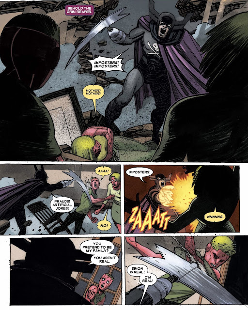 For casual fans, the significance of the Grim Reaper is huge. When Vision was created, he was programmed with the brainwaves and personality of fellow Avenger Wonder Man to help him socialize better with humans. The Grim Reaper is Wonder Man's brother who swore revenge against the Avengers when he believed Wonder Man to be dead. However since then, Grim Reaper also has a beef against Vision who he sees as a "cheap imitation" of his brother.