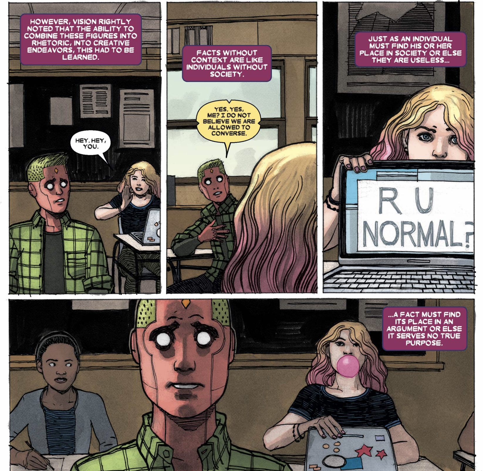 This brings up the secondary thesis of Vision, acting superficially normal without fully understanding the meaning behind the actions. The Visions, but especially Virginia, are more or less going through the motions of normalcy.