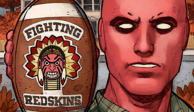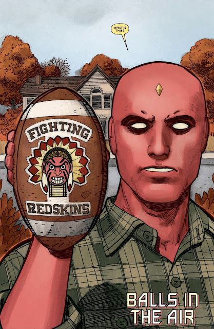 Anyways, Vin ends up being a jerk and phasing through the ball again, much to Viv's chagrin. Vision spots the ball and is troubled by the racist Native American mascot on it.