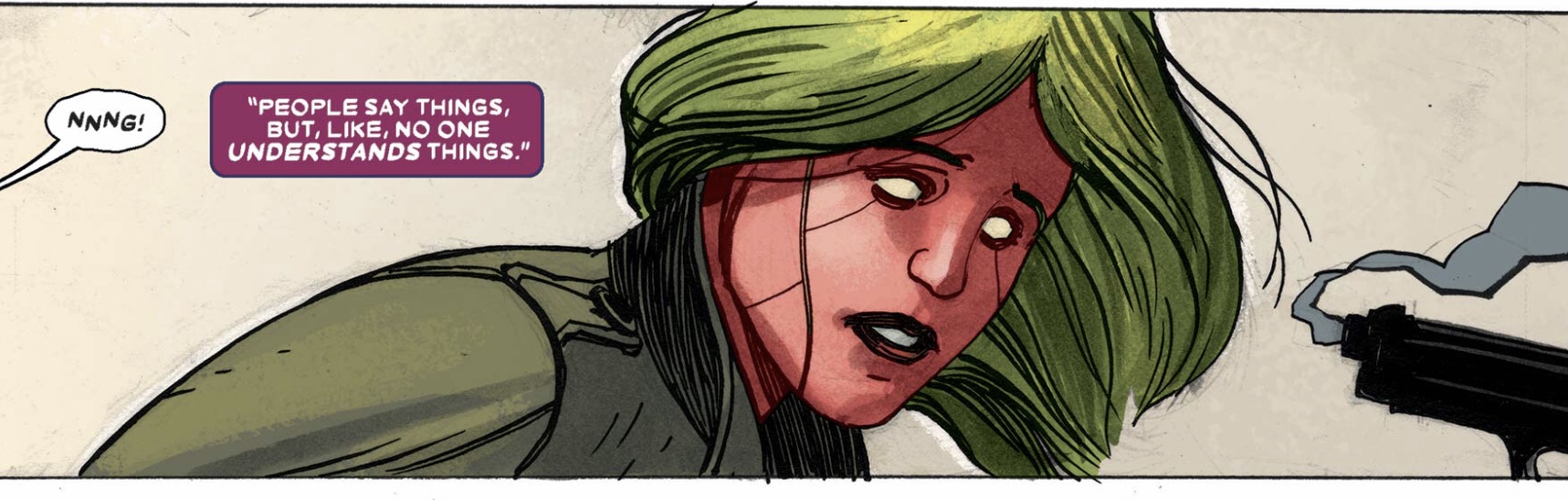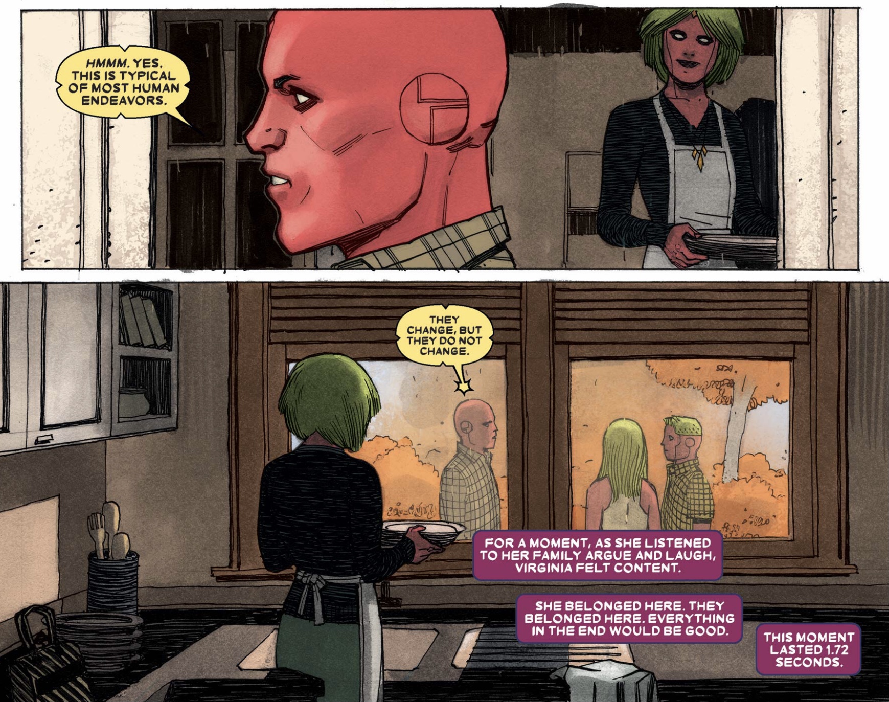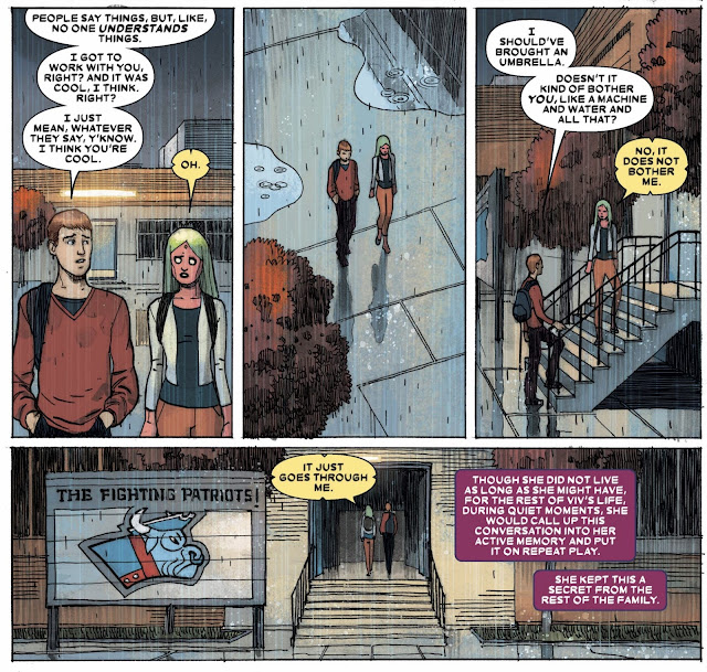 Notice how artist Gabriel Hernandez Walta visually portrays how disconnected Virginia is from the rest of the family. While the Vision, Viv, and Vin are in the outside with warm autumn colors, Virginia is physically cut off by a wall and enshrouded in the shadows.