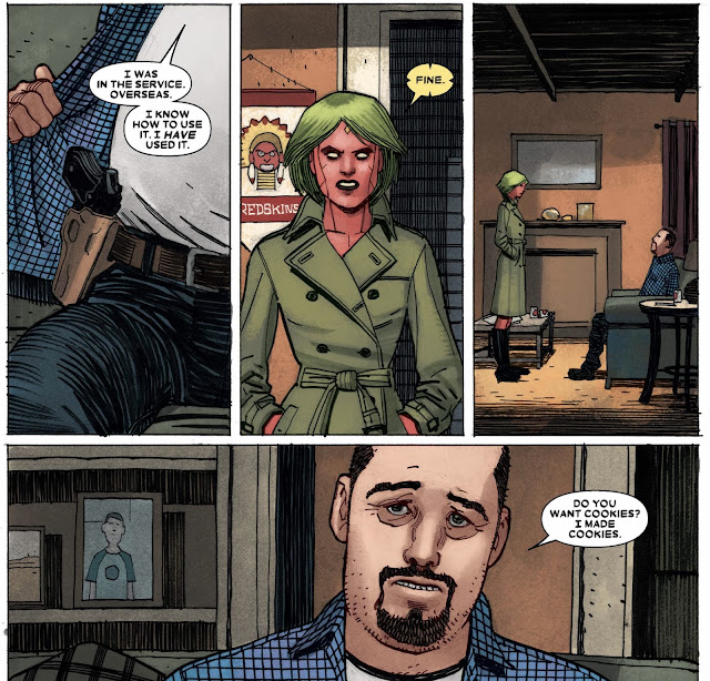 What's amusing is how surprisingly cordial CK's father is to Virginia despite blackmailing her. He invites her in, shows his gun as a mild threat, and then asks if she wants any cookies. The cookies here symbolize a human way of "welcoming others".