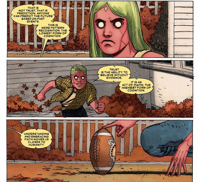 Incidentally, that is one interpretation of the issue's title "Balls in the Air". Vision insists he does not want the kids flying while playing football because it is not normal. But his insistence is also artificially restraints the family and puts unnecessary pressure on them.