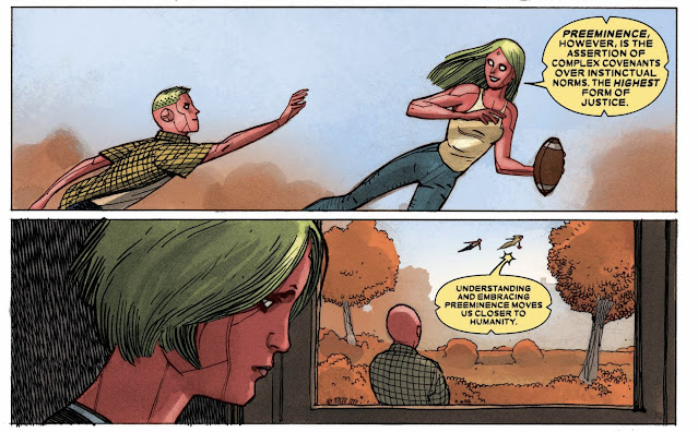 When Vision throws the ball, Viv catches the ball by phasing through Vin. When he screams that wasn't fair, Viv shoots back, "Now brother, fairness is simply mathematically determined balanced, the lowest form of justice. Pre-eminence, however, is the assertion of complex covenants over instinctual norms. The highest form of justice. Understanding and embracing preeminence moves us closer to humanity."