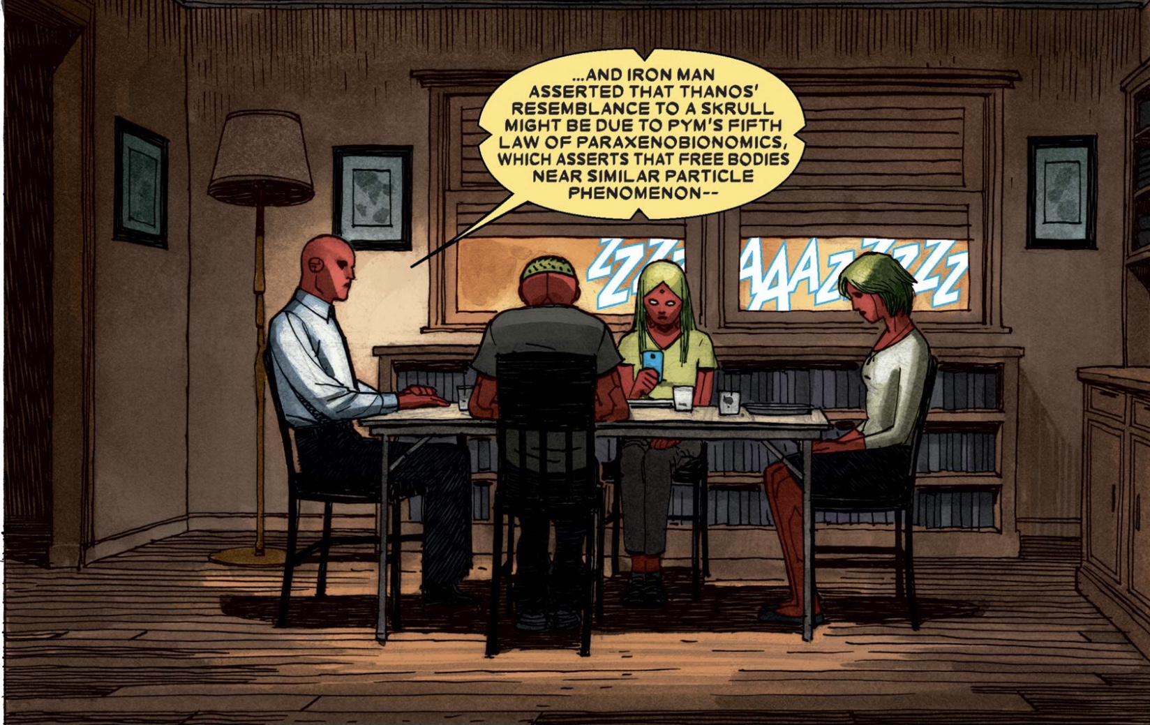 Side-note: check out the Vision family's new table. In the previous chapter, Virginia broke the dining table in a fit of anger. Now the family uses what looks like a folding table. There is nothing important about that detail, it's just amusing.