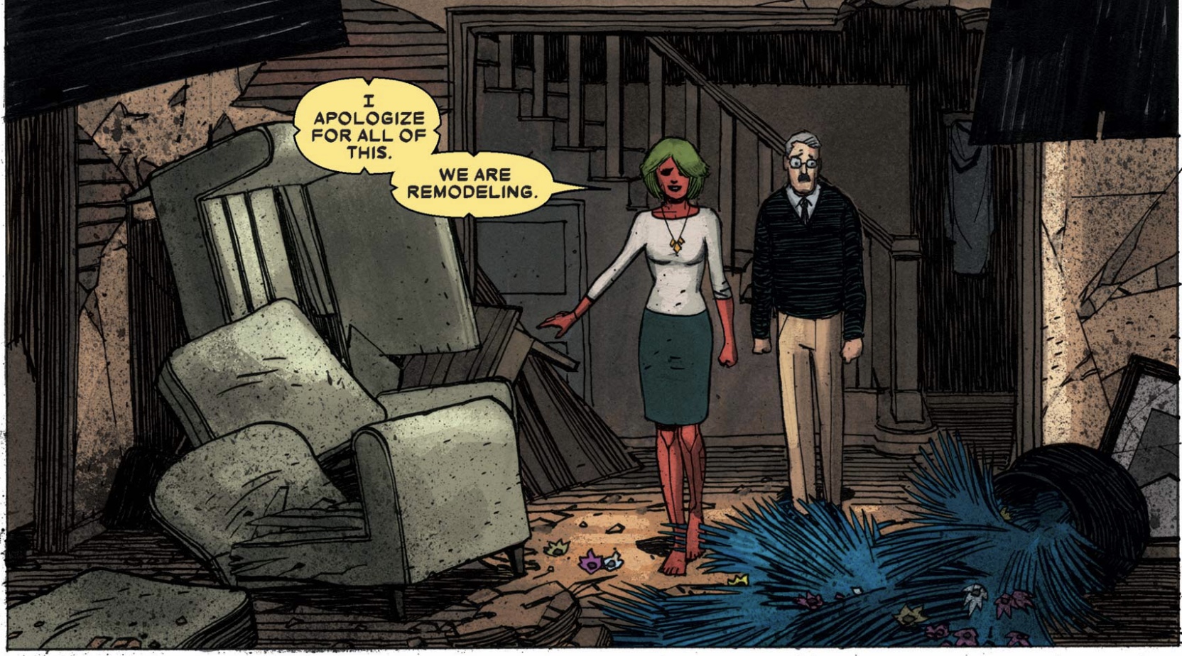 Speaking of broken household items, when their neighbor George comes over to search for their missing dog the next day, we see that the house is a wreck and Viv is crying in a corner. King chose to imply the horror of Vision's apparently violent reaction to the news of Virginia's list of sins. Ironically, imagining the Vision's reaction is actually scarier.