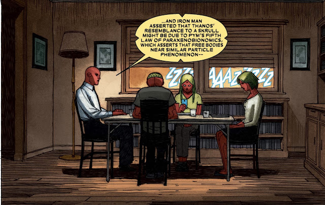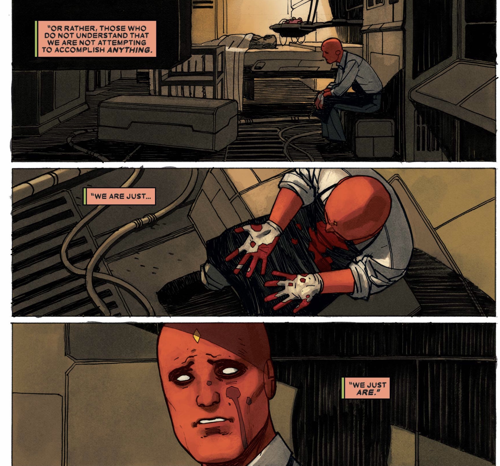 But the ominous narration indicates how Vision's choice is ultimately NP. So what do you do when you determine a choice- like making a synthezoid family- is an impossible option? You can stop it here or you continue down the path, even though you know that it is flawed. That is the predicament that Vision faces and his choice is slowly eroding his moral code.