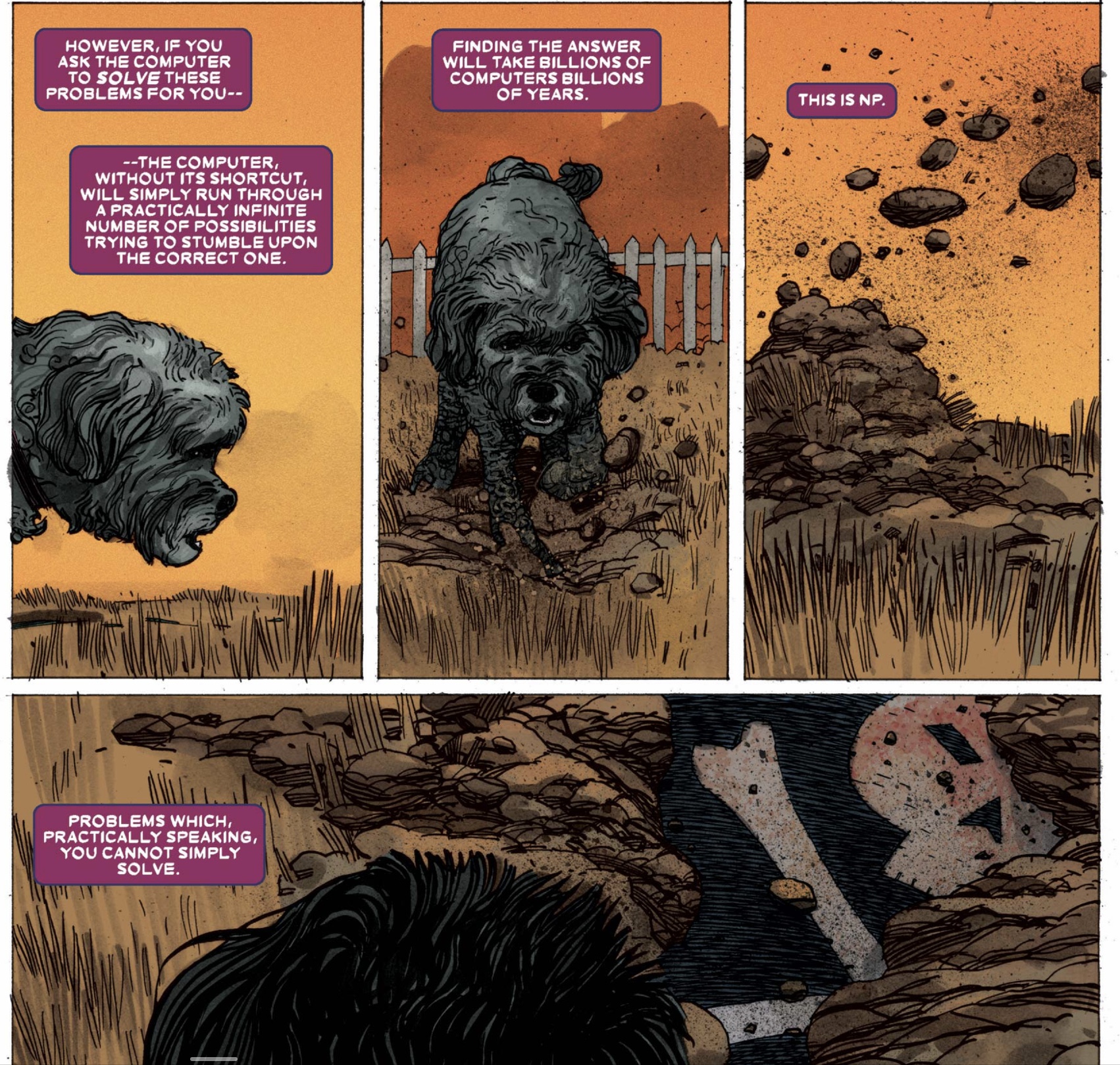 But problems continue to crop up or become uncovered. This conflict is literalized as we see in real time as we see an old problem get literally uncovered. The neighborhood dog starts diggin up the Grim Reaper's corpse in the Visions' backyard. This parallel story telling connects the P v NP debate with the Visions' quagmire: Is being normal a P or a NP? So far their solutions have been short-term always snowball into a bigger problem down the road.