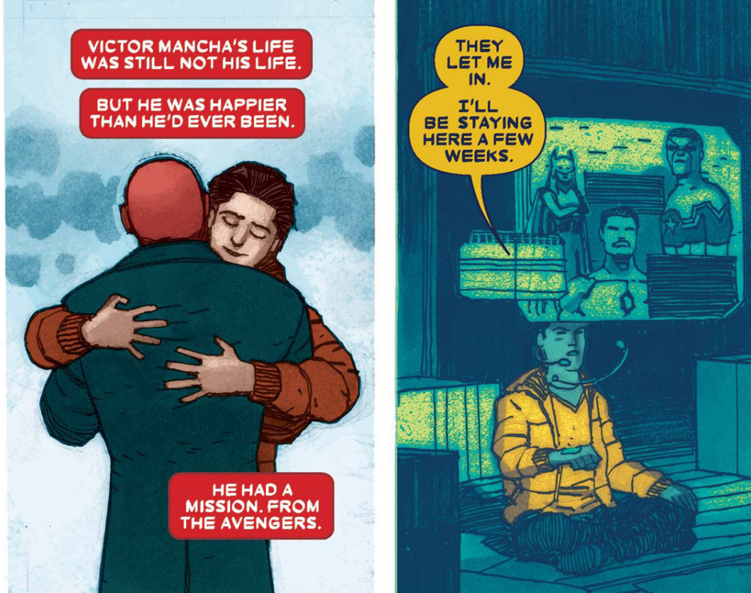 King repeated variations of the phrase: "Victor Mancha's life was not his life" It shows how Victor has a bit of an identity crisis since he learned that everything he thought he knew about his life was a lie. Since then, then he has been a bit aimless: bouncing from his original team to then the Avengers, and then just sitting around alone in an apartment.
