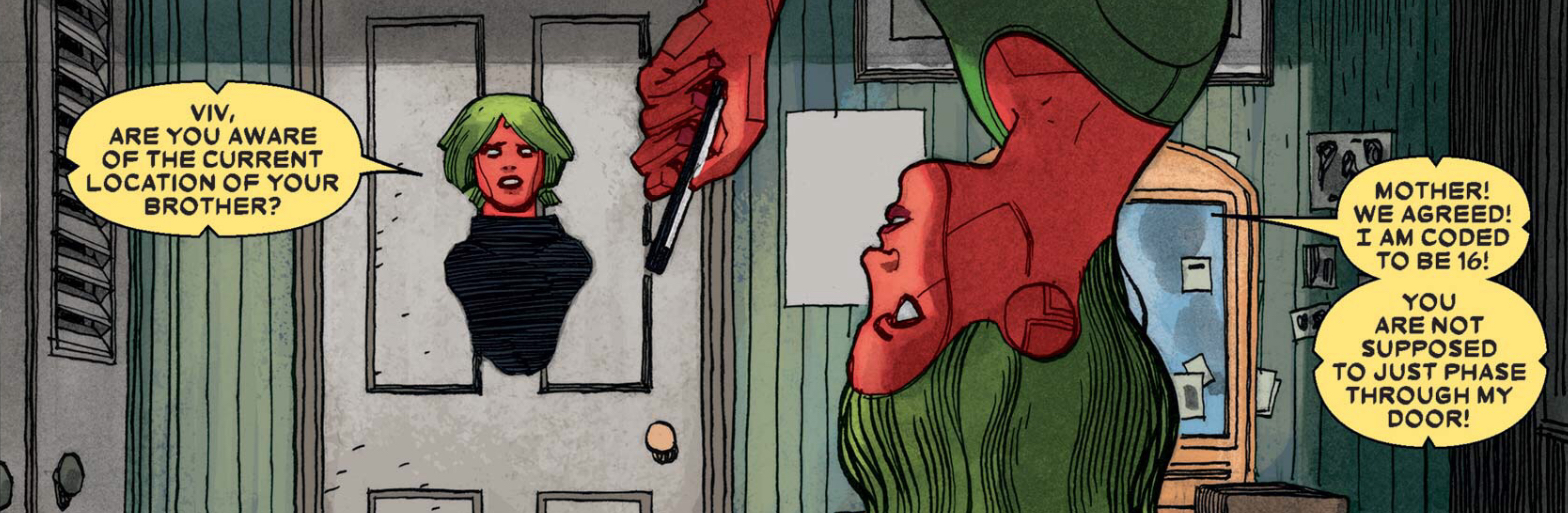 This is obviously a take off of the typical teenager-parent interactions, but King inserted humor by having them claim that they are "Coded " to be a certain role. You can also interpret the scene as another example of the Vision family going through the motions of what their familial roles as another effort to be "normal".